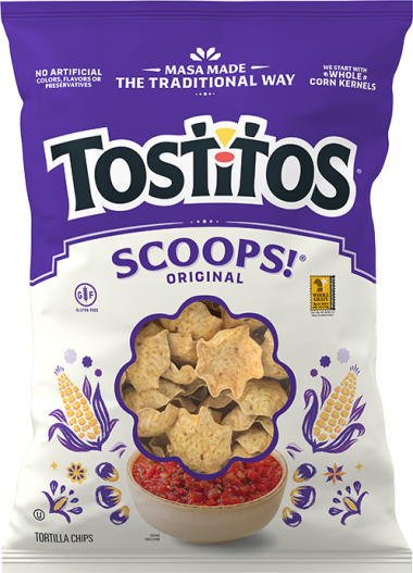 Crafted with a three-grain blend and designed in Scoops!® shape, Tostitos® Multigrain Scoops!® Tortilla Chips deliver a hearty crunch made for dipping. Thoughtfully made to hold your favorite dips, they bring people together around the bowl, one scoop at a time.